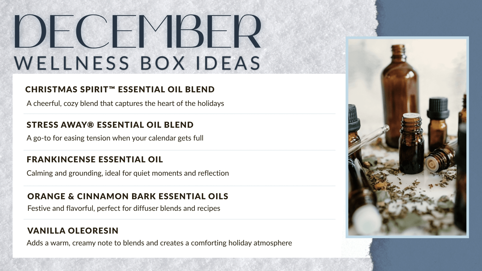 December wellness box ideas feature a few oils and blends that pair beautifully with your 25 Days of Diffusing resource and help support emotional balance, warmth, and holiday joy: